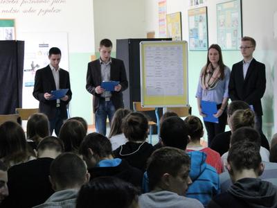 Pięknie o życiu szkoły i jej ofercie opowiadali: Martyna Grochowska-2A, Mateusz Kondratowicz-2C, Rafał Twarowski-2B i Mateusz Czajkowski-2A.